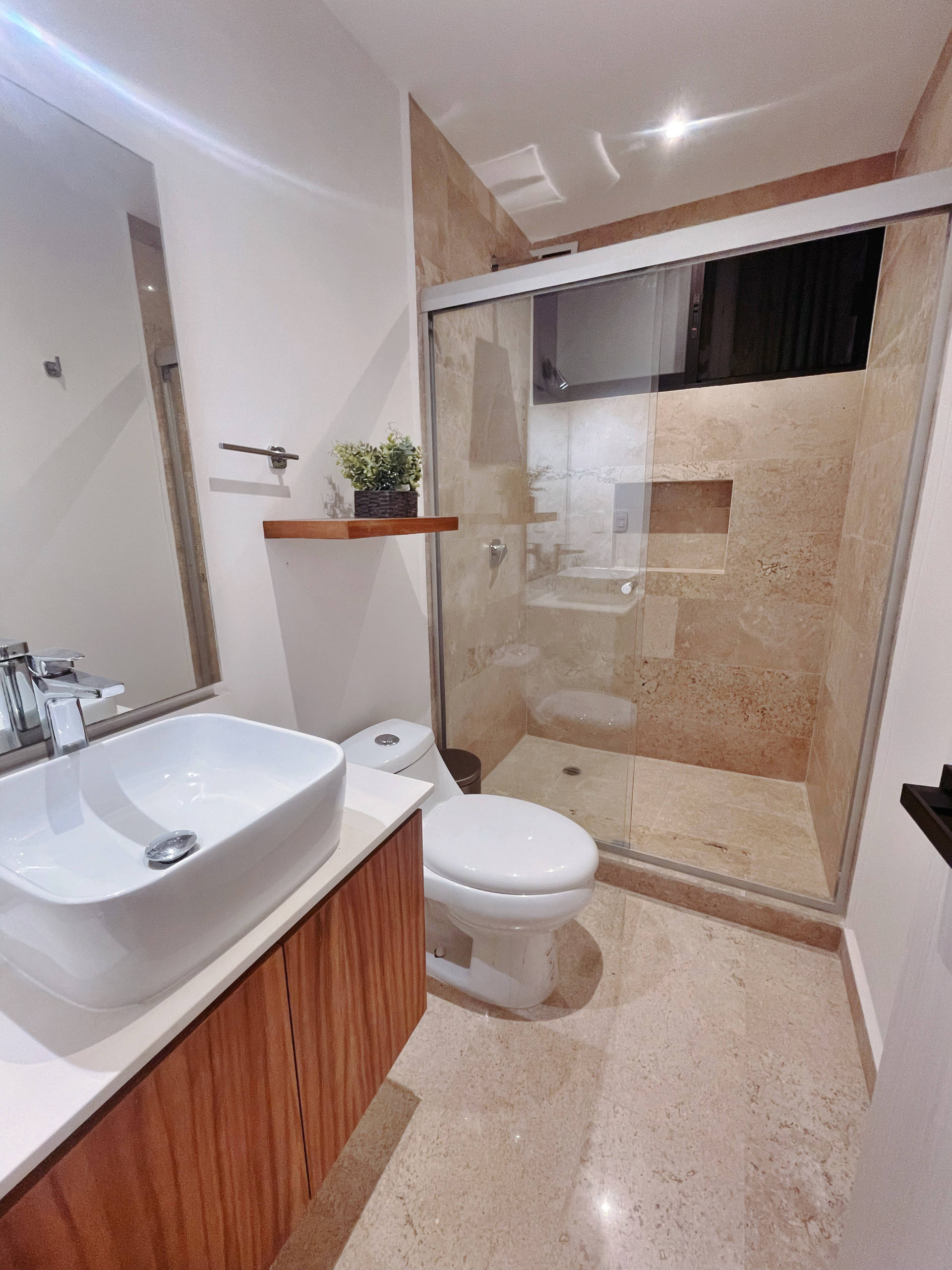 Dos baños con ducha proporcionan comodidad y facilitan la rutina diaria de los huéspedes. El apartamento incluye aire acondicionado y ventilador de techo para mantener un ambiente fresco y agradable durante todo el año.