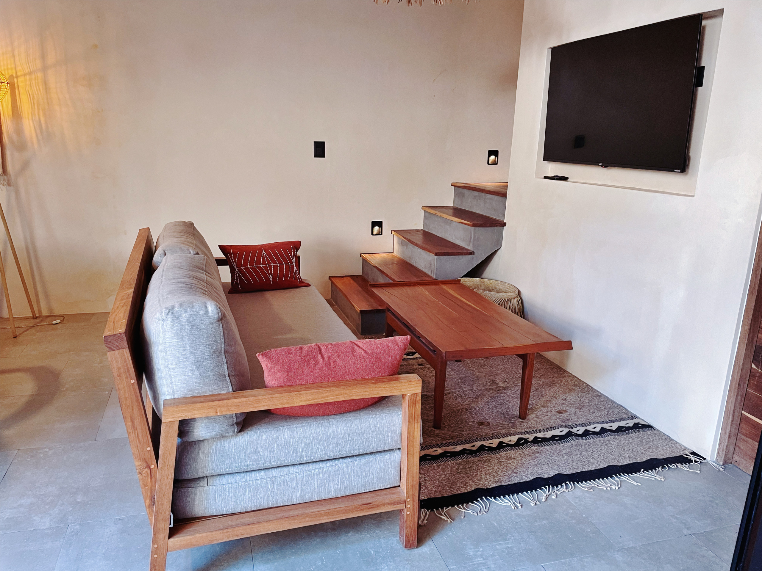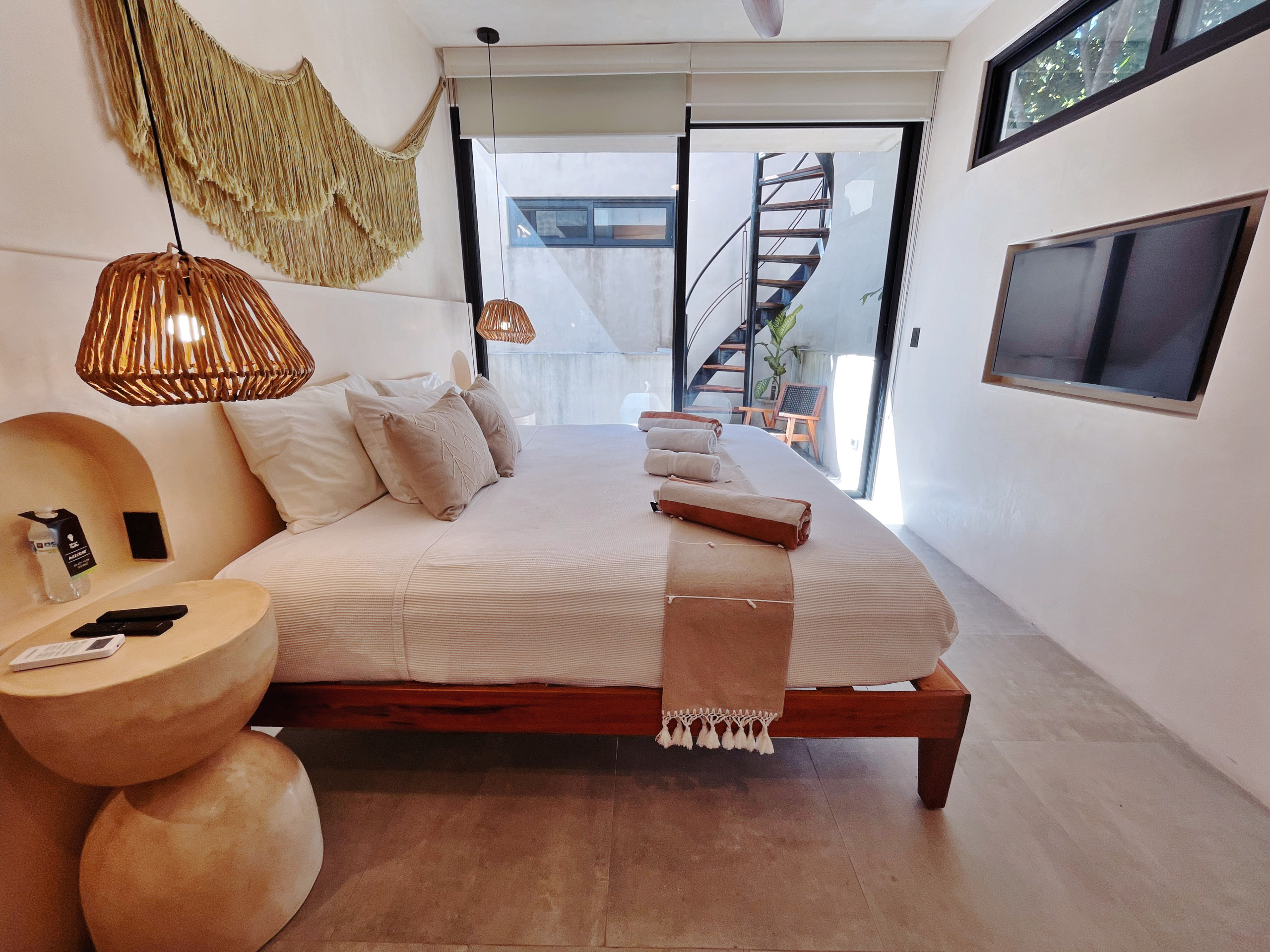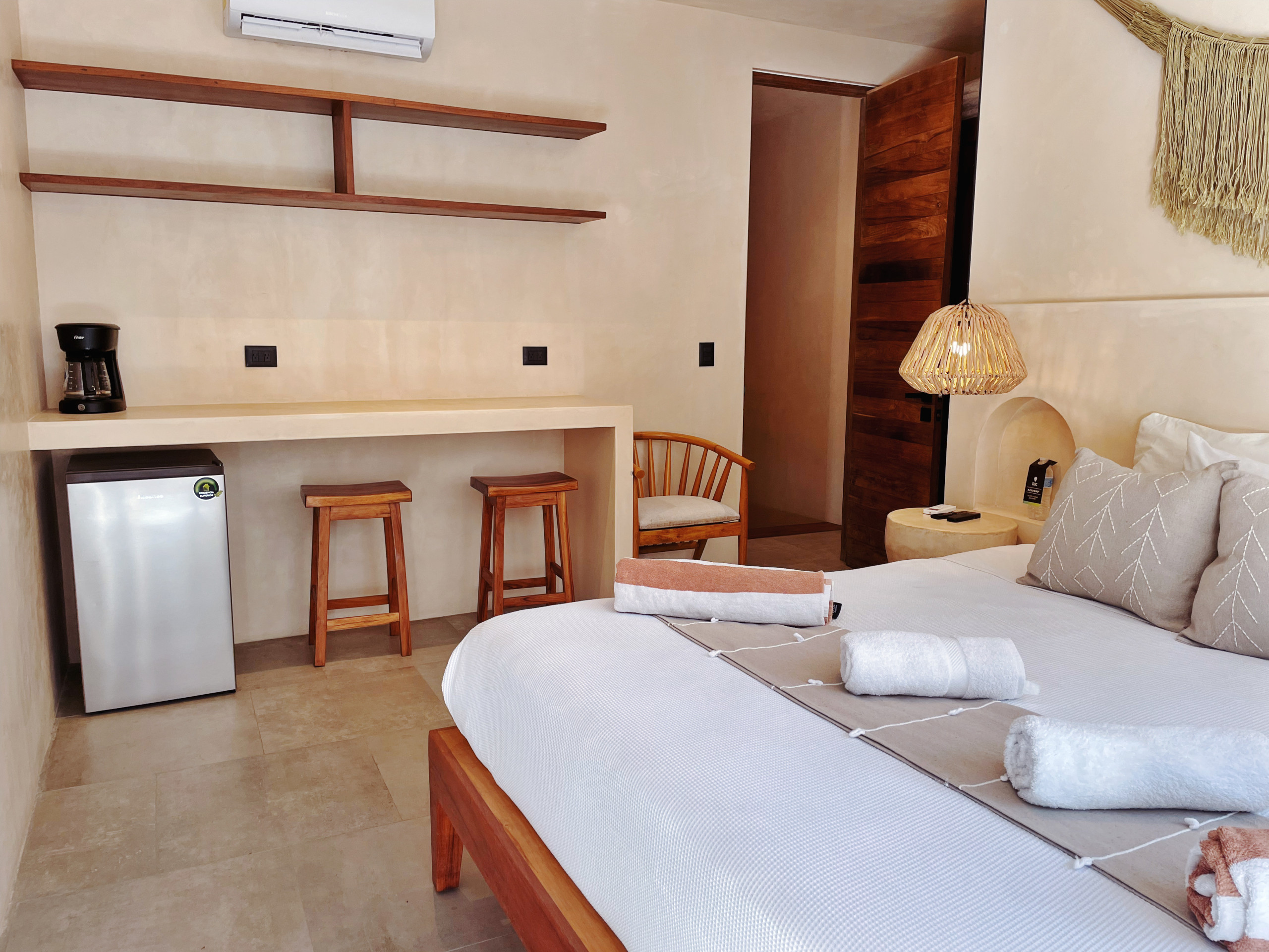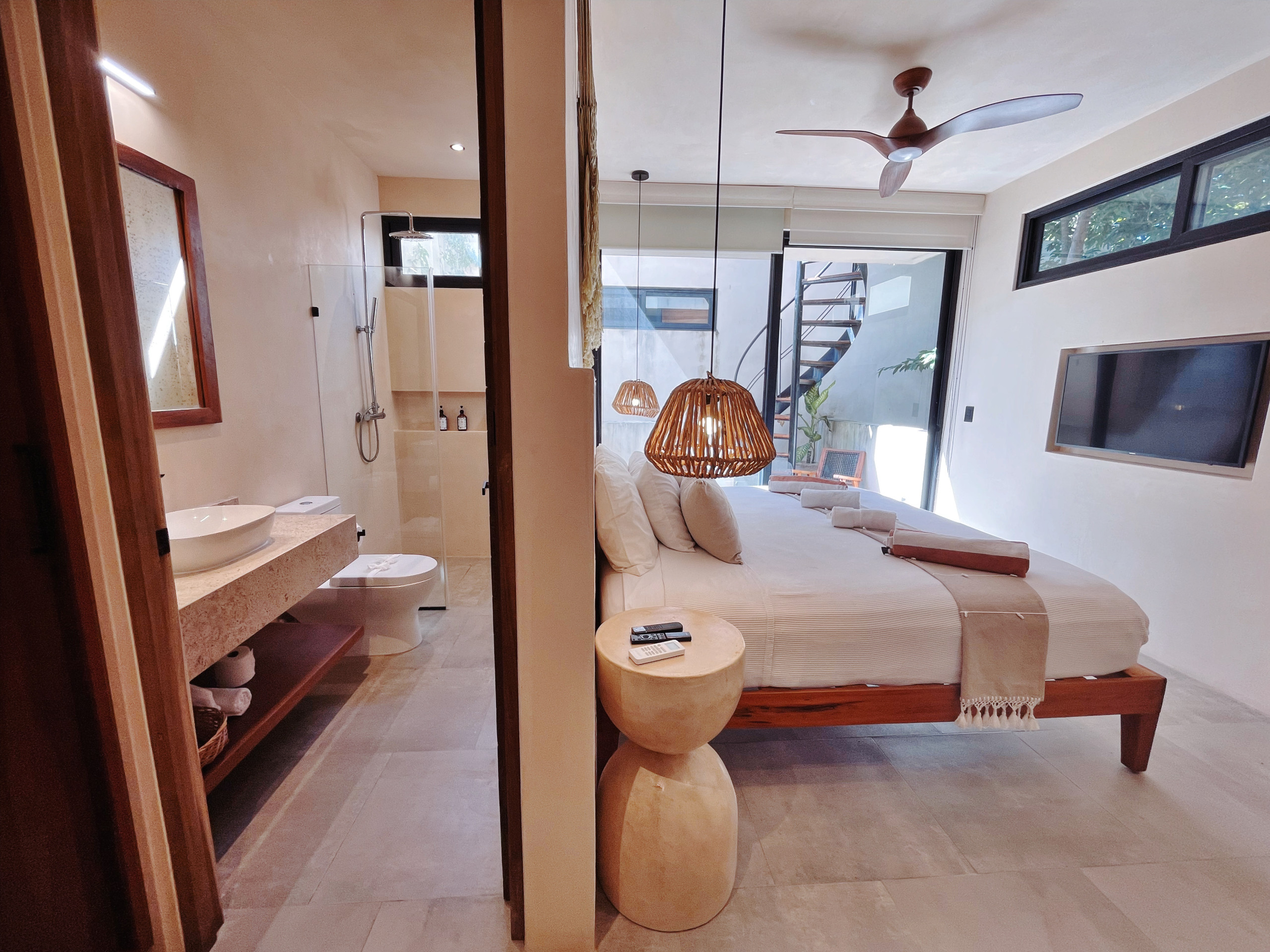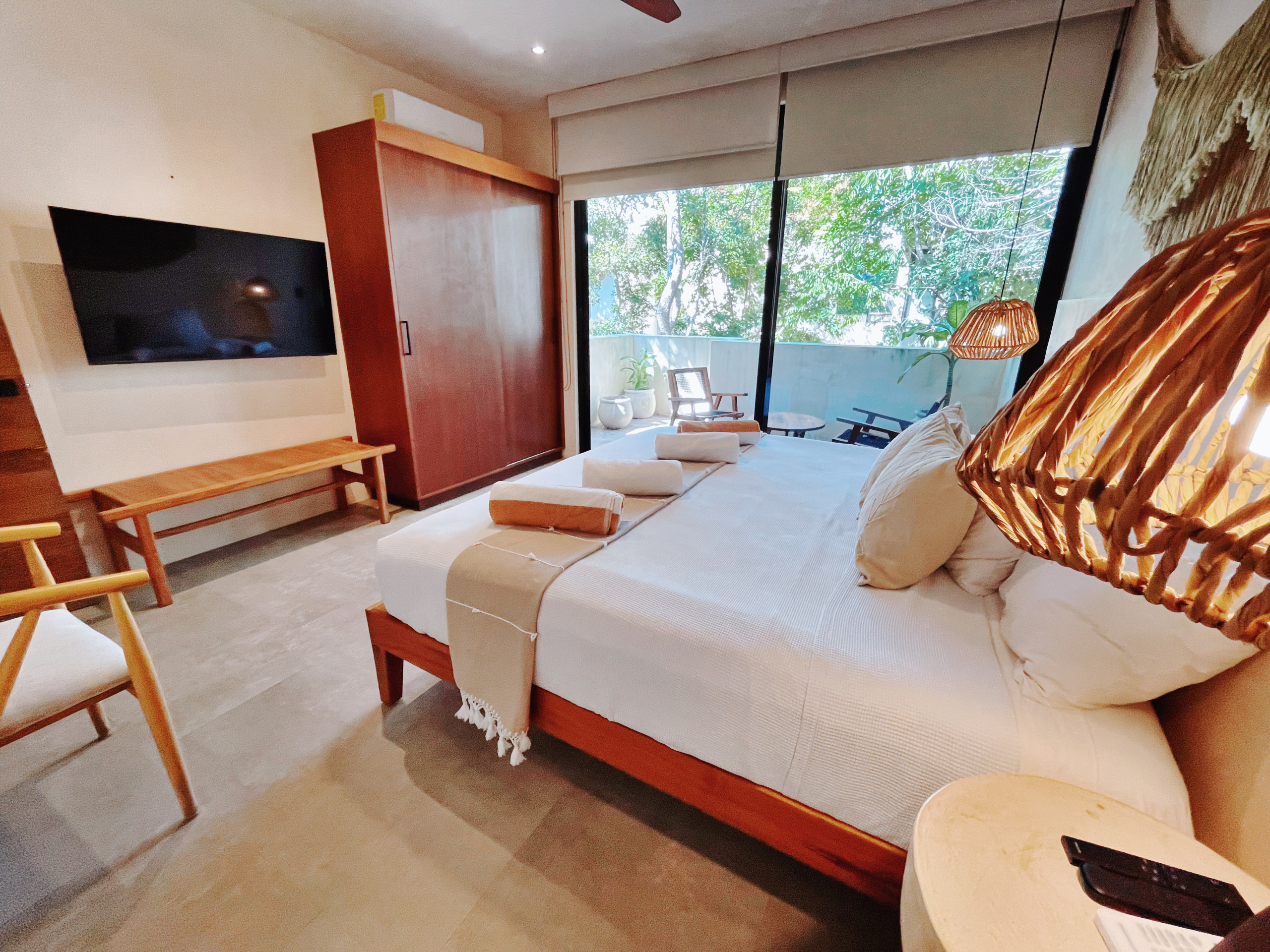 El ambiente está climatizado con aire acondicionado y ventilador de techo para mantenerte fresco en los días calurosos. Cuenta con conexión WiFi de alta velocidad, 3 televisores con canales en español e inglés, y comodidades como caja fuerte, plancha y hervidor de agua.